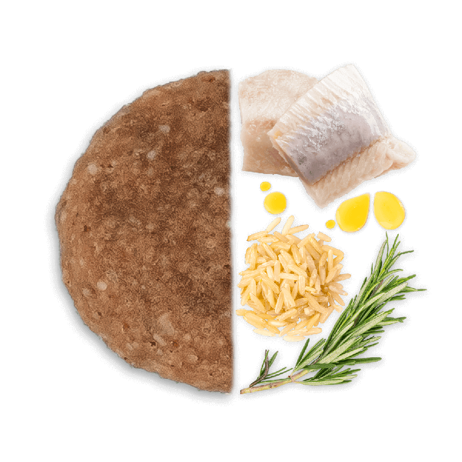 Sastāvs: slīpēti rīsi 39%, dehidratizētas zivis 22%, rīsu atsijas, alus raugs, biešu mīkstums 6%, vistas tauki, dzīvnieku proteīnu hidrolizāts, zivju eļļa 1%, minerālvielas, mannānoligosaharīdi (MOS) 0,2%, fruktooligosaharīdi (FOS) 0,08%, Yucca schidigera.