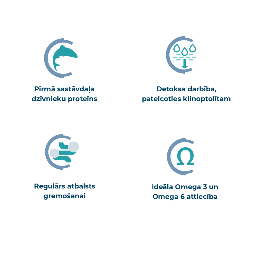 Ideāla omega-3 un omega-6 attiecība: pareizai fizioloģisko funkciju uzturēšanai; veicina veselīgu apmatojuma stāvokli.
