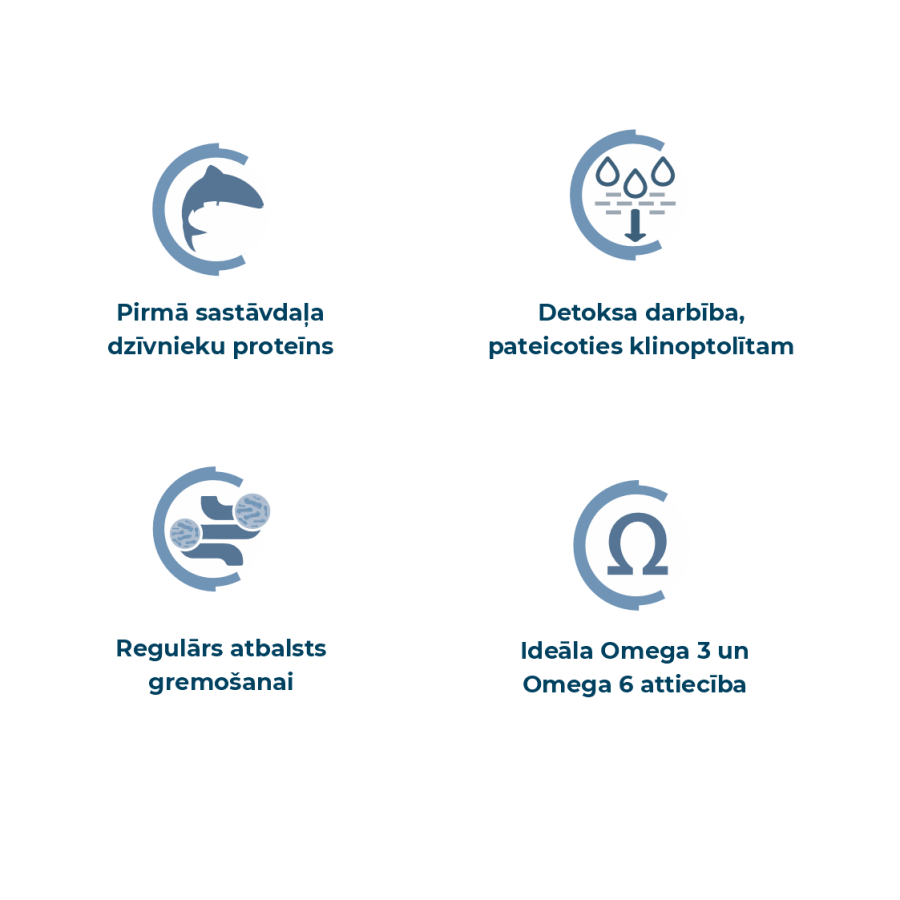 Analītiskie komponenti: kopproteīns 26%, koptauki 13%, kopšķiedra 2,6%, koppelni 7,4%, omega-3 + omega-6 2,7%.