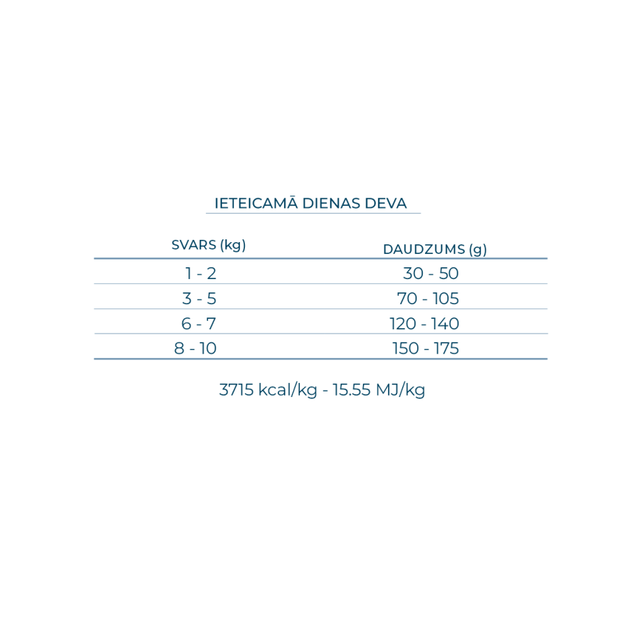 Sastāvs: dehidratizētas zivis 22%, baltais sorgo 21,5%, kukurūza, rīsu atsijas, vistas tauki, kukurūzas proteīns, biešu mīkstums 4%, dzīvnieku proteīnu hidrolizāts, zivju eļļa 1%, minerālvielas, mannānoligosaharīdi (MOS) 0,13%, fruktooligosaharīdi (FOS) 0,05%, Yucca schidigera.