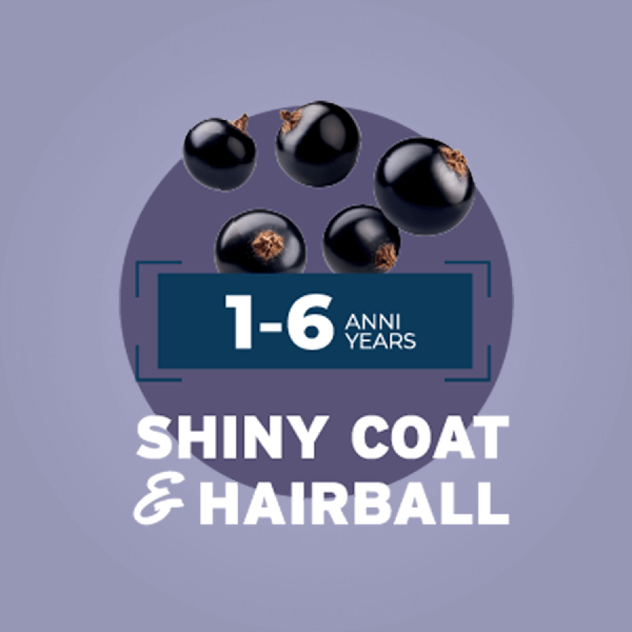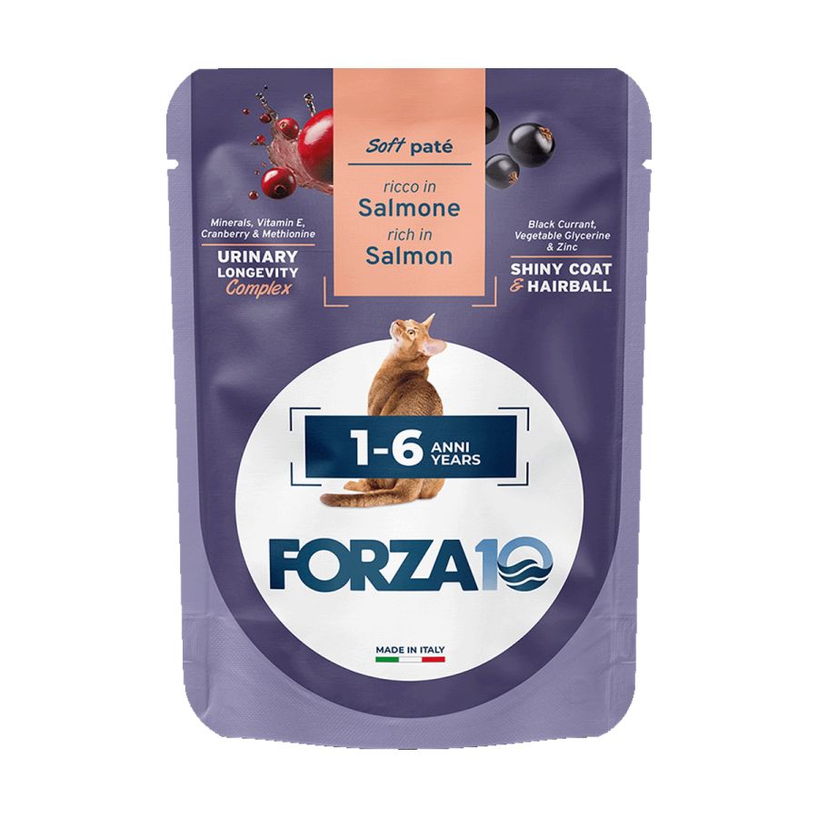 Sastāvs: gaļa un gaļas produktu atvasinājumi, zivis un to produktu atvasinājumi (lasis 14%), raugi, eļļas un tauki (laša eļļa 0,1%), augļi (dzērvenes 0,01%, upenes 0,01%), augu izcelsmes produkti (augu izcelsmes glicerīns 0,01%), minerālvielas.