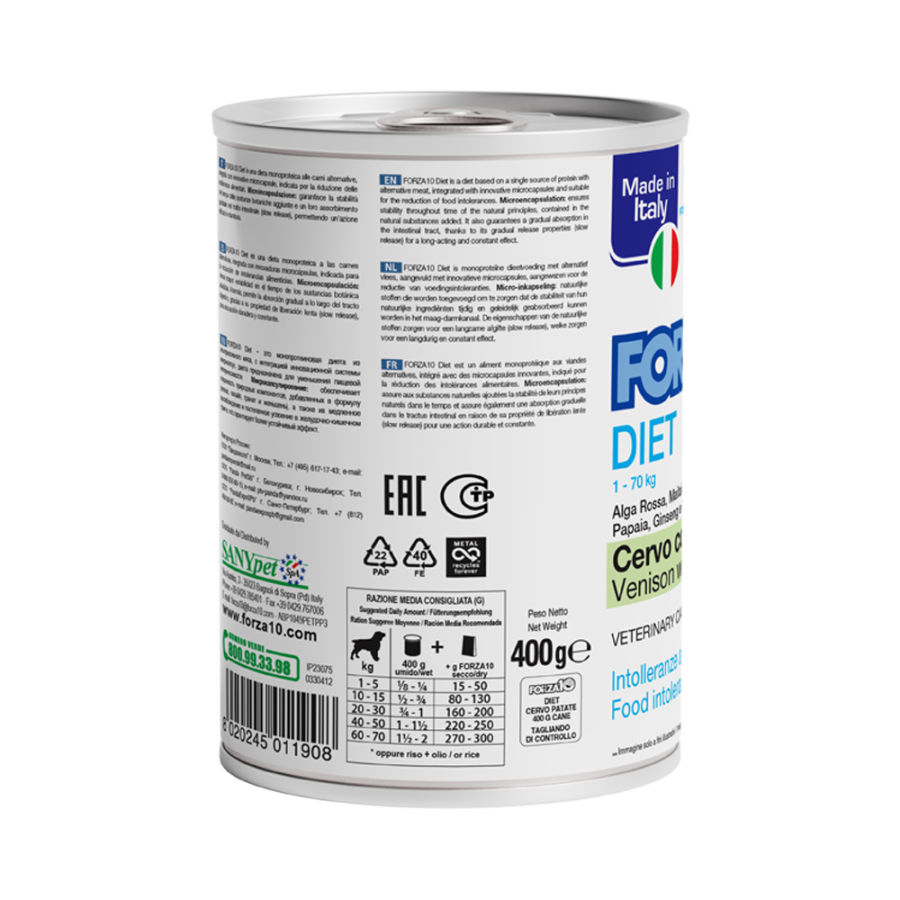 Sastāvs: gaļa un gaļas produktu atvasinājumi 48% (brieža gaļa 100%), kartupeļi 4,1%, augu tauki un eļļas, minerālvielas, ciete, Grifola frondosa 0, 0135 %, augu pārstrādes produkti (Ananas spp. 0,013 %), svaigu augļu un dārzeņu pārstrādes produkti un līdzprodukti (Carica papaya 0,012 %), garšaugu pārstrādes produkti (Aloe vera 0,0066 %), aļģes (Haematococcus pluvialis (astaksantīns 0,0025 %)).