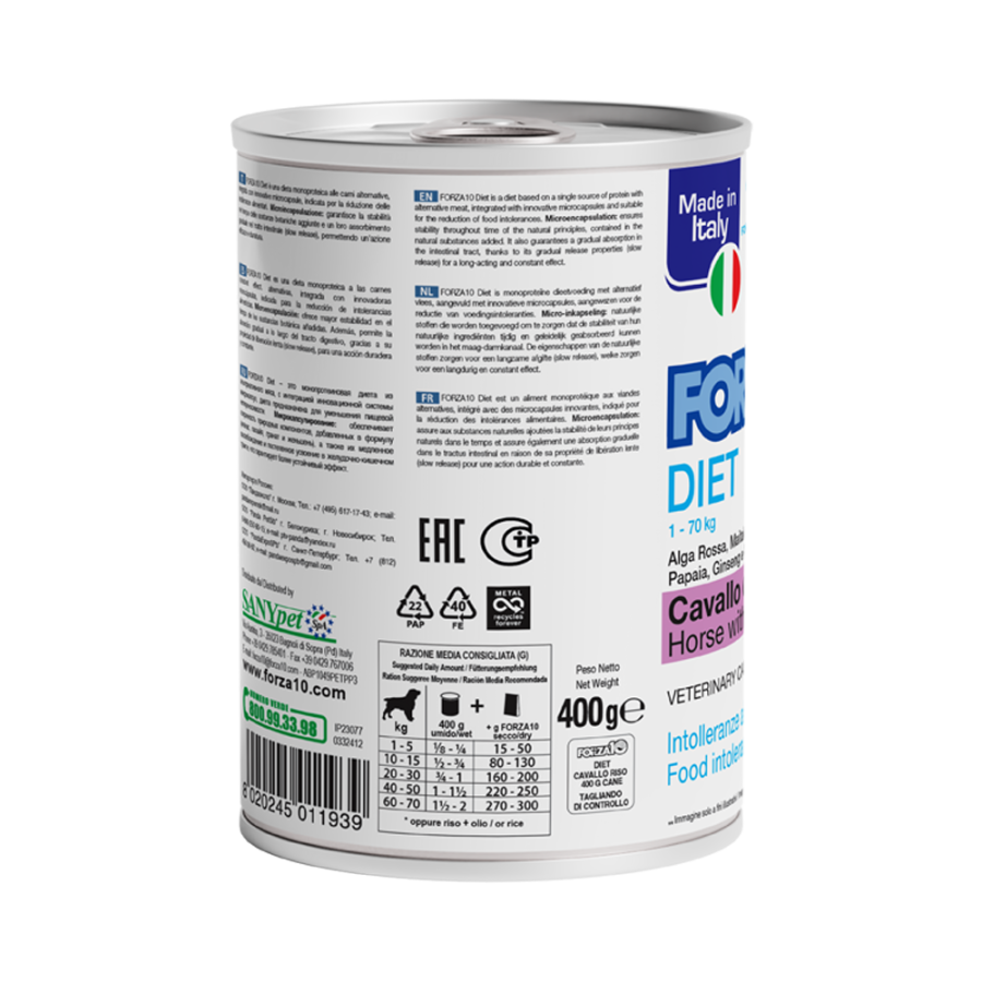 Būtiskās uzturīpašības:izvēlēts proteīna avots (zirgs). Ieteicamais lietošanas ilgums: no 3 līdz 8 nedēļām. Ja nepanesamības pazīmes pazūd, šo barību sākotnēji var lietot līdz vienam gadam.