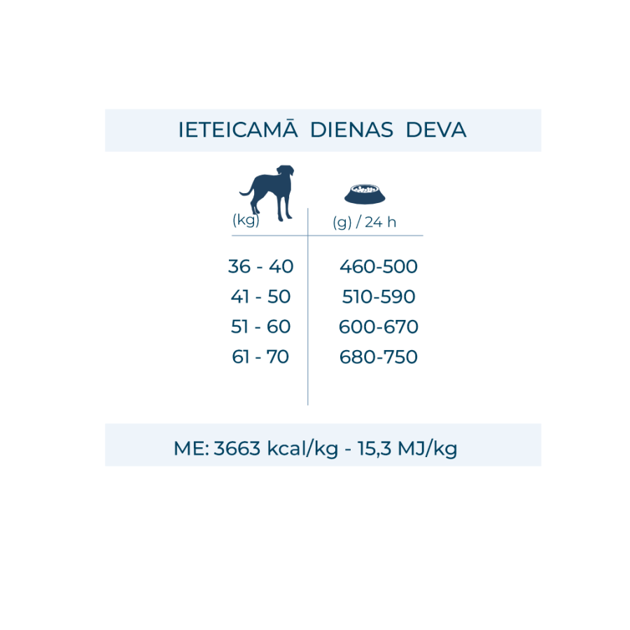 ME: 3663 kcal/kg - 15,3 MJ/kg.