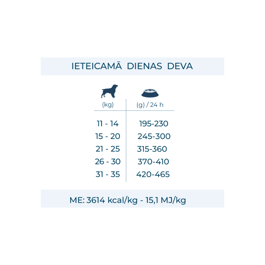 Analītiskie komponenti: kopproteīns 25%, koptauki 12%, kopšķiedra 2,5%, koppelni 8%, omega-3 + omega-6 2,4%.