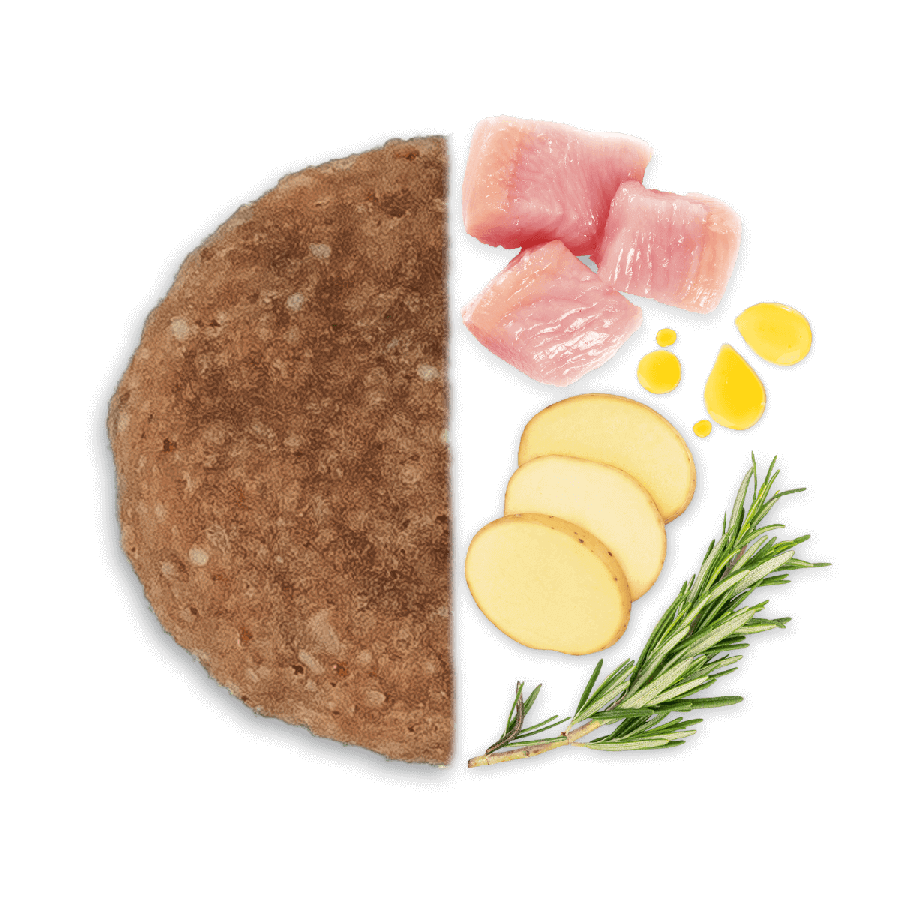 Sastāvs: dehidratizēts vistas proteīns 21%, baltais sorgo, kukurūza, rīsu atsijas, biešu mīkstums 5%, kartupeļi 4%, vistas tauki, slīpēti rīsi, dzīvnieku proteīnu hidrolizāts, dehidratizētas zivis, zivju eļļa 1%, minerālvielas, mannānoligosaharīdi (MOS) 0,2%, fruktooligosaharīdi (FOS) 0,08%, Yucca schidigera.