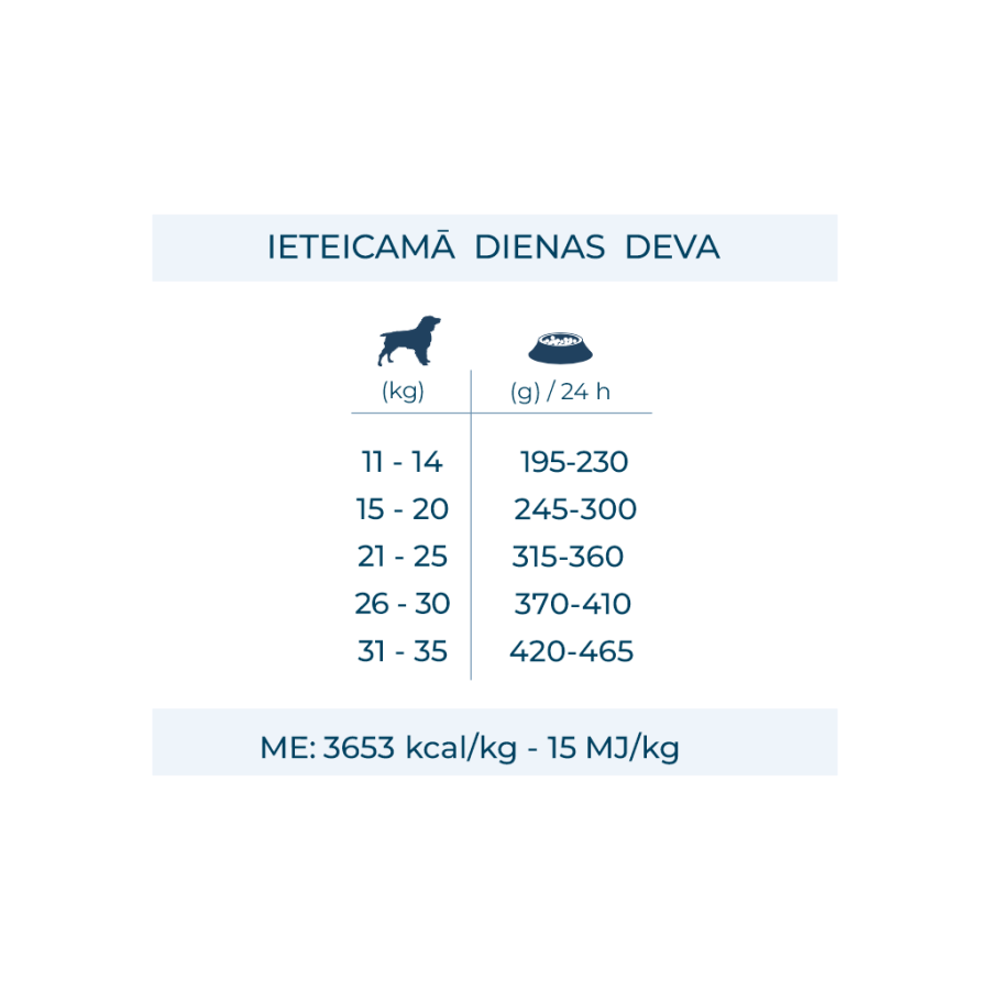 Analītiskie komponenti: kopproteīns 24%, koptauki 12%, kopšķiedra 2,4%, koppelni 7%, omega-3 0,7%, omega-6 2,9%.
