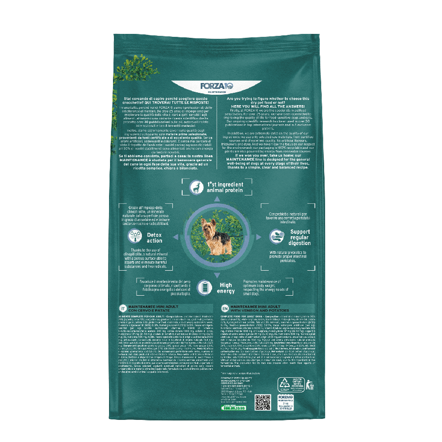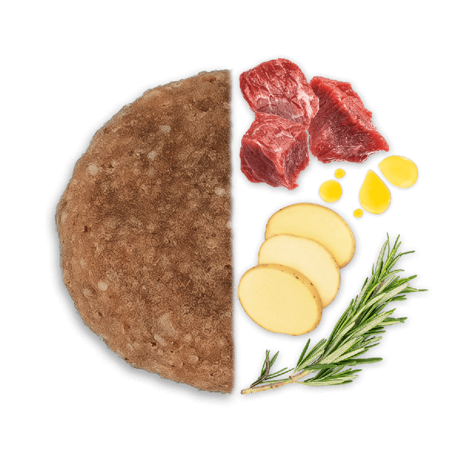 Sastāvs: dehidratizēts dzīvnieku proteīns 20% (jēra, brieža 5%), baltais sorgo, kukurūza, rīsu atsijas, kukurūzas proteīns, vistas tauki, kartupeļi 4,1%, dzīvnieku proteīnu hidrolizāts, zivju eļļa 1,3%, minerālvielas, mannānoligosaharīdi (MOS) 0,13%, fruktooligosaharīdi (FOS) 0,05%, Yucca schidigera 0,024%.