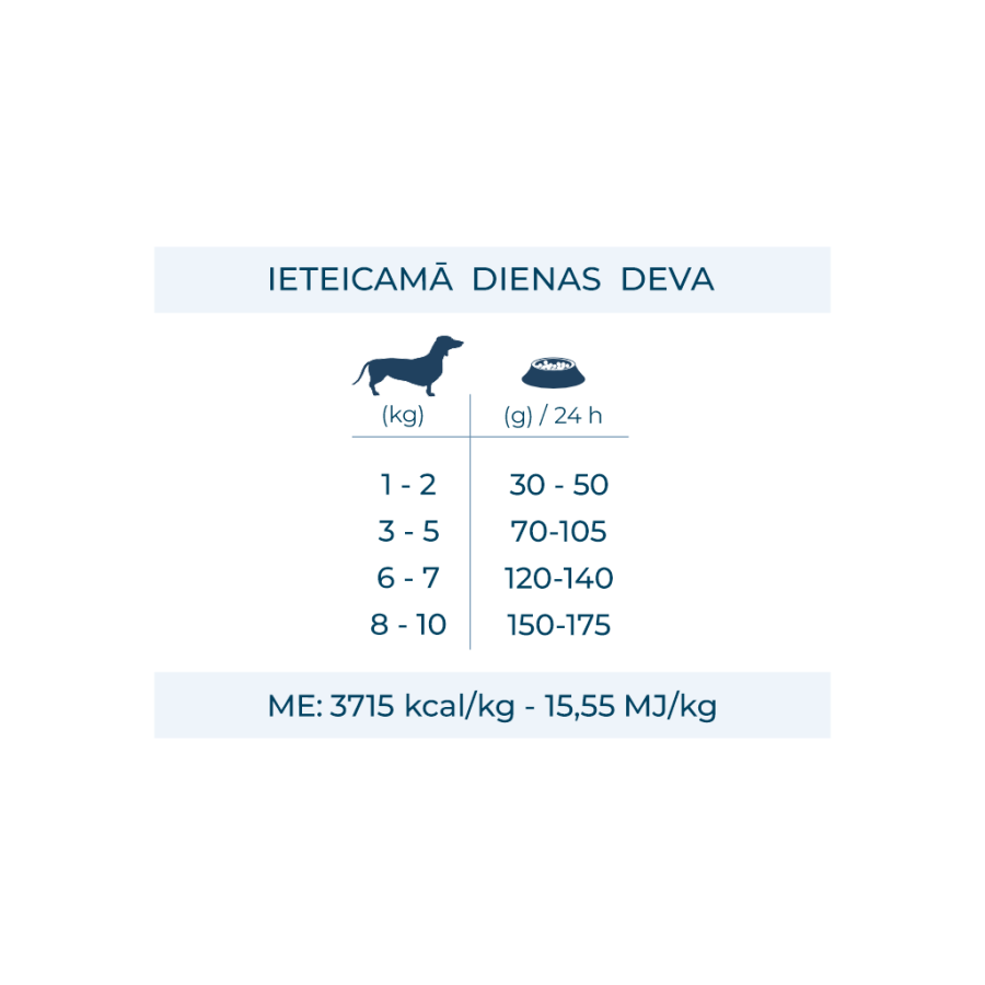 • Augsts enerģijas saturs: veicina optimāla ķermeņa svara uzturēšanu, ievērojot maza auguma suņu enerģijas vajadzības.