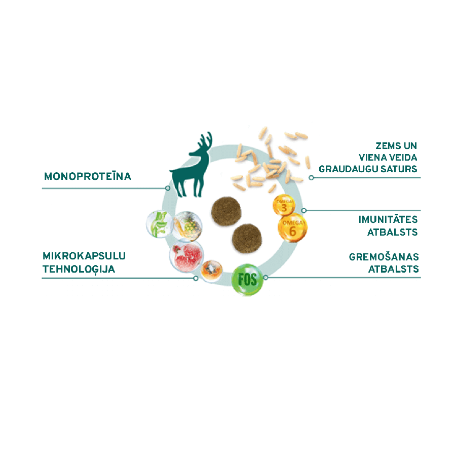 Monoproteīns: sastāvā brieža gaļa, kas iegūta no dzīvniekiem, kas nāk no neskartām pļavām un mežiem - augstas kvalitātes un barības vielu ziņā līdzsvarots proteīna avots.