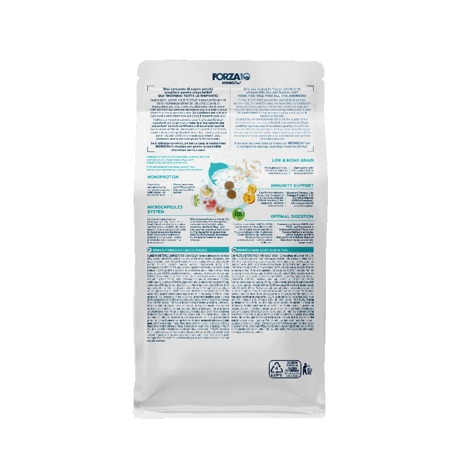 Sastāvs: dehidratizētas zivis 23%, slīpēti rīsi 22,5%, kukurūzas proteīns, zirņu ciete, rīsu atsijas, kukurūzas proteīns, eļļas un tauki (no tiem zivju eļļa 3%), veseli zirņi, alus raugs, biešu mīkstums, dzīvnieku proteīnu hidrolizāts, minerālvielas, mannānoligosaharīdi (MOS) 0,2%, fruktooligosaharīdi (FOS) 0,08%, augu glikozamīns (no raudzēšanas) 0,04%, Grifola frondosa 0,027%, svaigu augļu un dārzeņu pārstrādes produkti un līdzprodukti (Carica papaya 0,025%), augu pārstrādes produkti (Ananas spp. 0,025%), Yucca schidigera 0,024%, garšaugu pārstrādes produkti (alvejas gela pulveris 0,013%), aļģes (Haematococcus pluvialis (astaksantīns 0,005%)).
