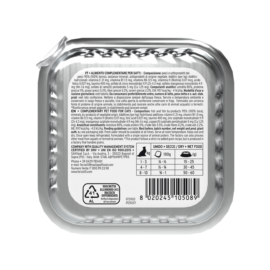 Sastāvs: zivis un to produktu atvasinājumi 95% (tuncis 100%), minerālvielas, augu izcelsmes produkti.