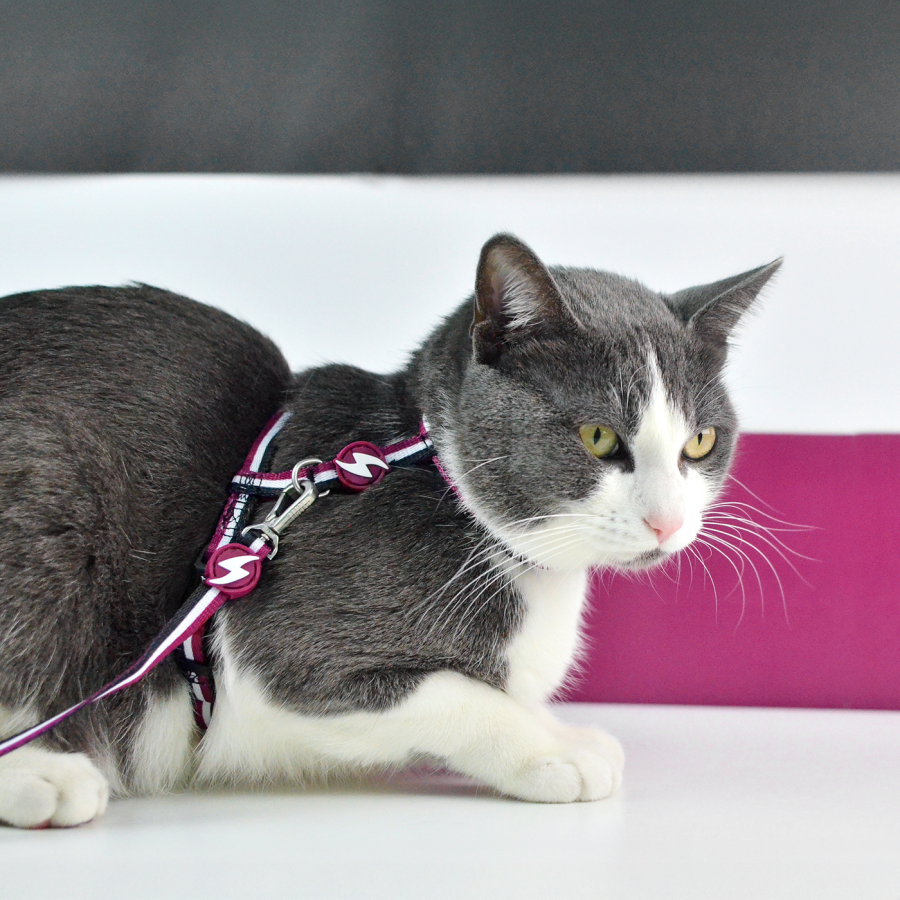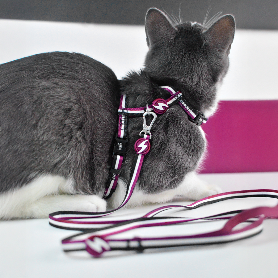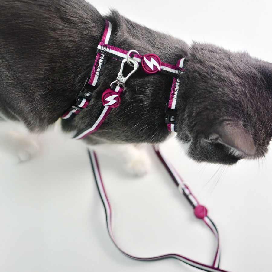 Mūsu kaķu krūšu siksnas ir izgatavotas no izturīga poliestera, pilnībā regulējamas, nodrošinot maksimālu pielāgošanos jūsu kaķa augumam. Tā aprīkota ar četru punktu sprādzes fiksācijas sistēmu, kas garantē jūsu mīluļa drošību pastaigu laikā. Krūšu siksnai muguras pusē ir piestiprināts D-gredzens, kurā ērti varat pievienot komplektā iekļauto pavadu. Arī pavada ir izgatavota no izturīga poliestera, un tās rokturis darināts no mīksta neoprēna, nodrošinot komfortu turētājam.