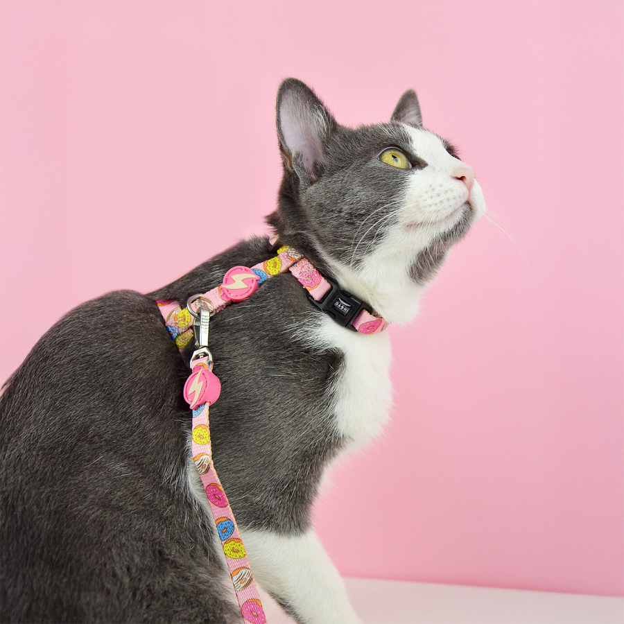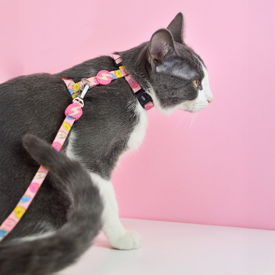 Mūsu kaķu krūšu siksnas ir izgatavotas no izturīga poliestera, pilnībā regulējamas, nodrošinot maksimālu pielāgošanos jūsu kaķa augumam. Tā aprīkota ar četru punktu sprādzes fiksācijas sistēmu, kas garantē jūsu mīluļa drošību pastaigu laikā. Krūšu siksnai muguras pusē ir piestiprināts D-gredzens, kurā ērti varat pievienot komplektā iekļauto pavadu. Arī pavada ir izgatavota no izturīga poliestera, un tās rokturis darināts no mīksta neoprēna, nodrošinot komfortu turētājam.