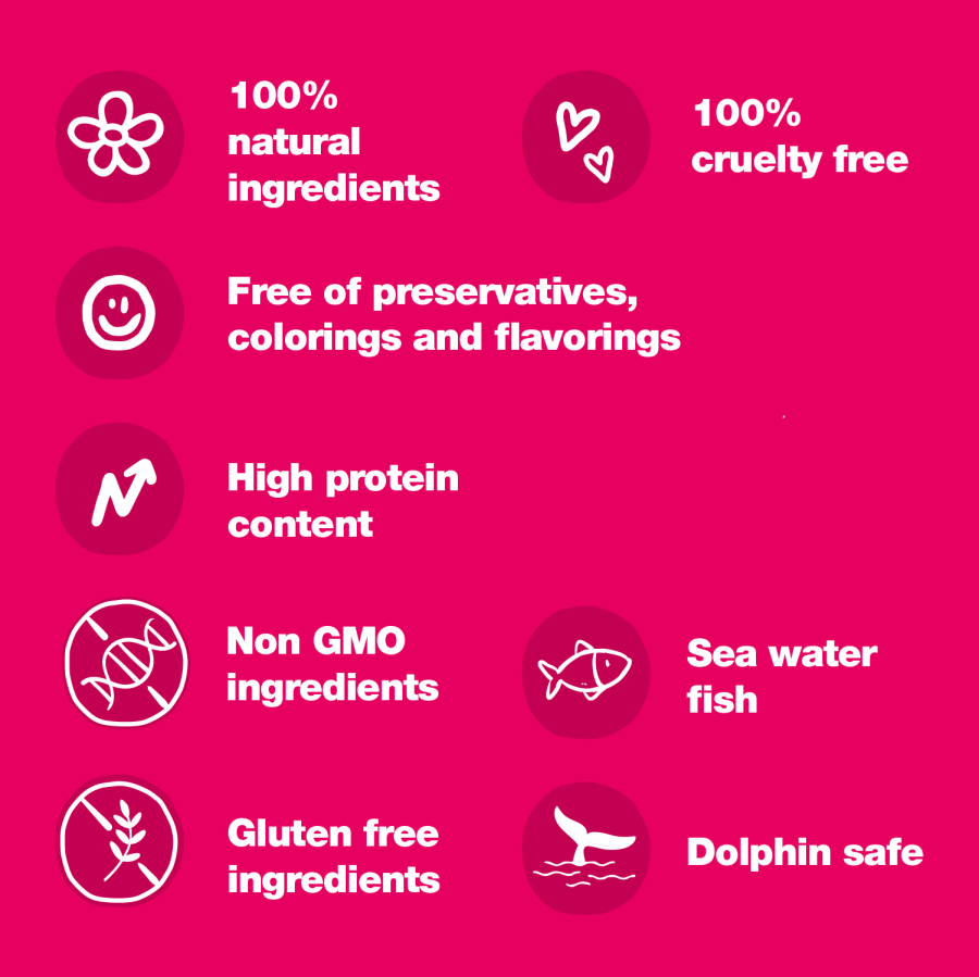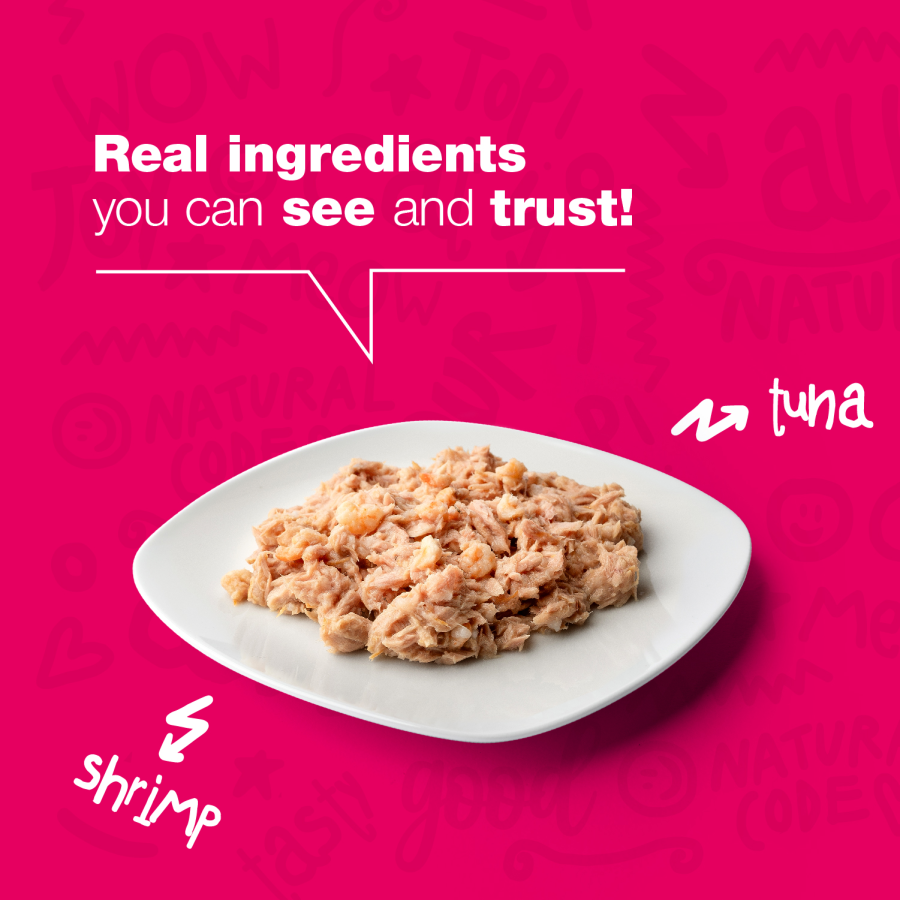 Šis tunča un garneļu maisījums nodrošina kaķi ar viegli sagremojamām olbaltumvielām un palīdz saņemt ikdienā nepieciešamās minerālvielas. Tuncis un garneles dod arī neaizvietojamās taukskābes, kas palīdz nodrošināt spīdīgu apspalvojumu un veselu ādu.