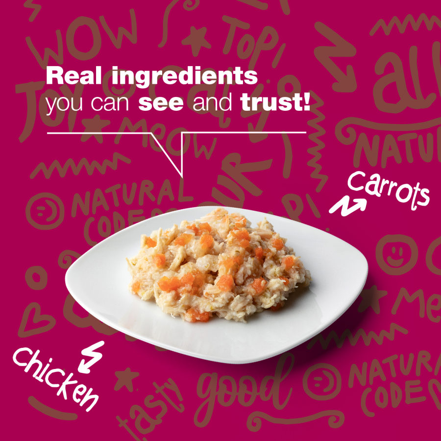 Šajā barībā viegli sagremojamo balto gaļu – vistu gaļu – papildina amarants – sastāvdaļa ar neskaitāmām īpašībām: tas nav graudaugs, nesatur glutēnu un sastāvā daudz olbaltumvielu un neaizvietojamu aminoskābju, īpaši lizīna. Visbeidzot, burkāni palīdz nodrošināt ar svarīgām šķiedrvielām zarnu tranzīta veicināšanai. Barībai ir želejveida tekstūra, kas uzlabo garšu un nodrošina ūdens uzņemšanu.
