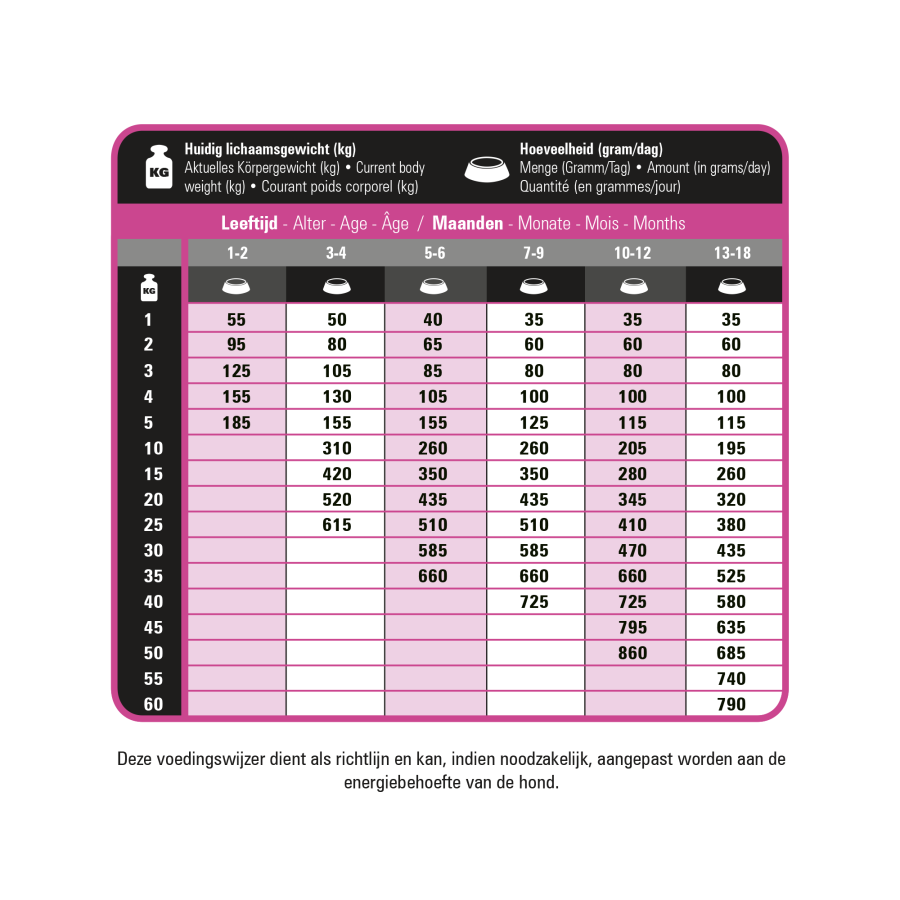 • Augsts enerģijas saturs kucēniem un jauniem suņiem. Paaugstināts tauku saturs, lai nodrošinātu jauno suņu enerģijas vajadzības. L-karnitīns palīdz tauku vielmaiņai.