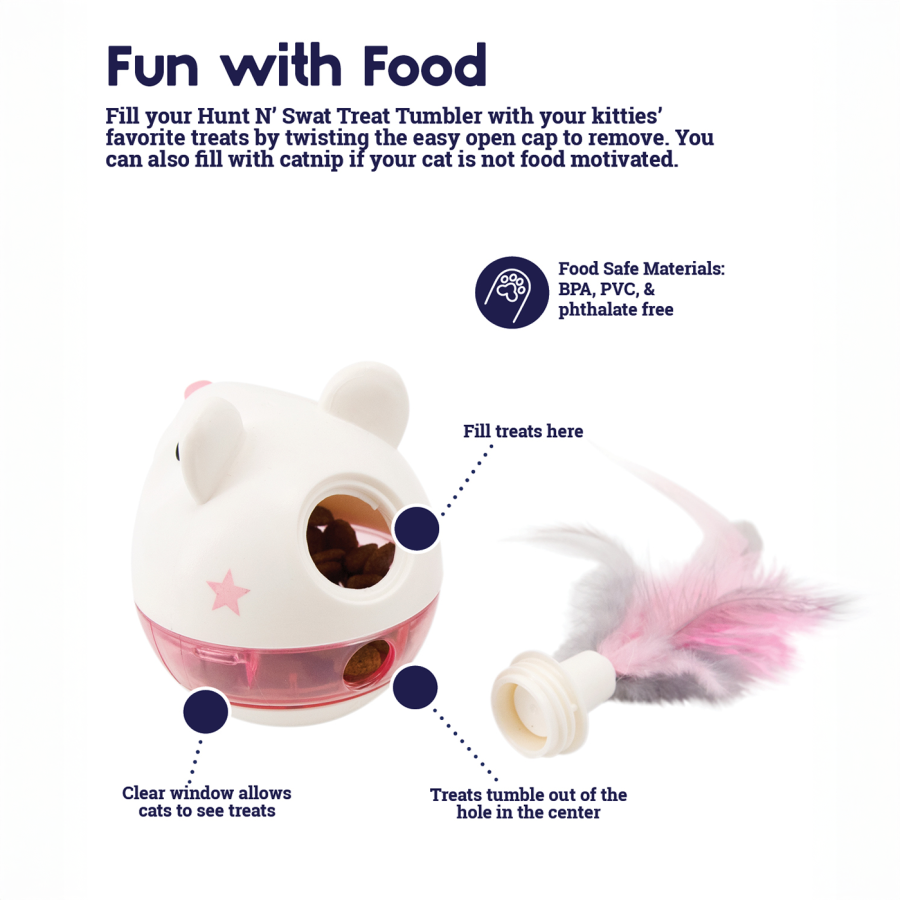 Catstages Hunt N Swat Treat Tumblers ir izcila interaktīvā puzle, kas izstrādāta, lai nodrošinātu jūsu kaķim aizraujošu nodarbošanos un izklaidi. Rotaļlietas neparedzamās kustības un spalvas aktivizē kaķa dabiskos medību un barības meklēšanas instinktus, padarot ēdienreizi par jautru izaicinājumu. Šī rotaļlieta mudina kaķi pielikt pūles, lai iegūtu kārumus un attīstītu prātu. Ar regulējamu grūtības pakāpi un viegli lietojamu skrūvējamu vāciņu uzpildīšanai, šī lēnēšanas rotaļlieta piedāvā jautru un aizraujošu veidu, kā pagarināt kaķa rotaļu laiku, vienlaikus saglabājot tā aktivitāti un labsajūtu.
