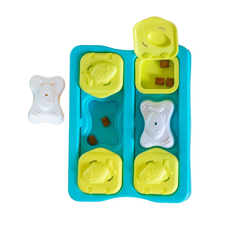 Catstages Nina Ottosson Kitty Cube ir superīga interaktīvā kaķu puzle, kas apvieno prāta stimulāciju, gardumu meklēšanu un izklaidi vienā aizraujošā spēlē. Šī kaķu puzle ir paredzēta pieaugušiem kaķiem un kaķēniem. Tajā ir 10 slēpti nodalījumi kārumiem, kuros ietilpst līdz aptuveni 85 g barības, tādējādi padarot to par ideālu lēnēšanas bļodu kaķiem, kas palīdz novērst pārēšanos. Jūsu atjautīgais kaķis noceļ kauliņus, atver vākus un bīda blokus, lai atrisinātu puzli, izmantojot savu prātu un dabiskās problēmu risināšanas prasmes. Uzturiet kaķa interesi, izmantojot dažādus grūtības līmeņus. Lietojiet to bez kauliņiem, lai nodrošinātu vieglāku spēli, vai palieliniet grūtības līmeni, pievienojot gardumus tikai dažiem nodalījumiem, tādējādi nodrošinot intensīvāku stimulāciju un problēmu risināšanas prieku. Šī kaķu rotaļlieta palīdz izklaidēt garlaikotos istabas kaķus, vienlaikus samazinot destruktīvu uzvedību. Neatkarīgi no tā, vai to izmanto kā gardumu puzli, lēnēšanas bļodu vai interaktīvu puzli - barības bļodu, tā veicina veselīgas ēšanas paradumus un aizraujošu spēli. Šī kaķu barības puzle ir izgatavota, domājot par drošību, tā ir izturīga, viegli tīrāma un ilgmūžīga. Lieliska alternatīva kaķu košļājamām un dentālām rotaļlietām, to var izmantot ne tikai kā rotaļlietu kaķiem, bet arī puzli maziem suņiem vai pat kucēniem mentālai stimulācijai! Šī stimulējošā puzle nodrošina bezgalīgu jautrību jūsu kaķim, vienlaikus uzturot to garīgi un fiziski aktīvu. Padariet maltītes un rotaļu laiku aizraujošāku ar šo interaktīvo kaķu rotaļlietu, kas veicina problēmu risināšanas prasmes un barības meklēšanas instinktus!