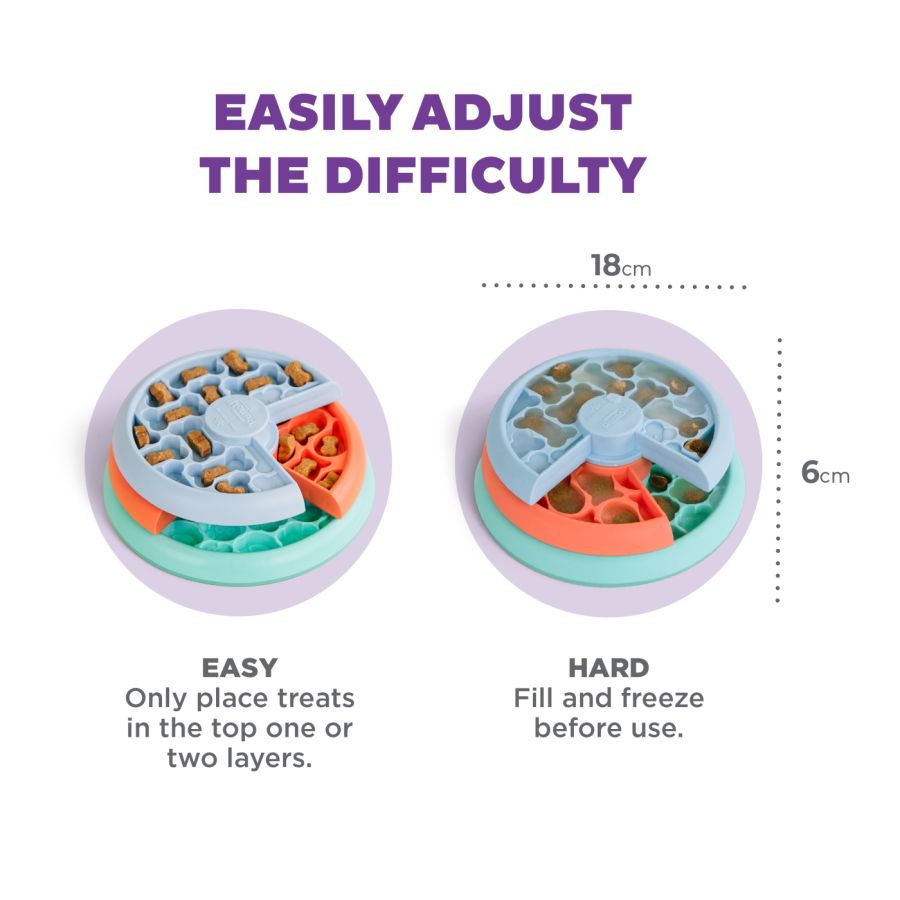 - Trīs rotējošie slāņi un vairāk nekā 60 gardumu nodalījumi, kas palīdz pagarināt jūsu suņa ēdienreizi un palēnināt ēšanas tempu.