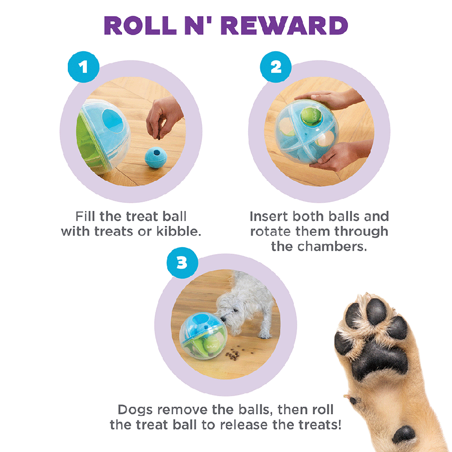- Trīs rotaļlietas vienā – suņi ripina A-Maze Ball, lai izdabūtu no labirinta mazās bumbas, un pēc tam - gardumu bumbu, lai tos izbērtu. Lai uzzinātu, kā padarīt spēli vieglāku vai sarežģītāku savam mīlulim, skatiet mūsu sadaļu „Padomi un triki”.