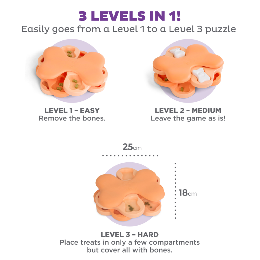 - 2. līmeņa vidēji sarežģīta puzle – lielisks veids, kā iepazīstināt ar kārumu spēlēm mīluļus ar nelielu puzļu risināšanas pieredzi vai bez tās, vienlaikus nodrošinot interaktīvu izaicinājumu atjautīgiem suņiem.