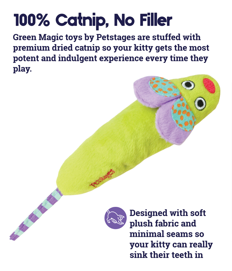 Catstages Green Magic kaķu rotaļlietu kolekcija ir radīta kaķiem, kuri dievina kaķumētru! Atšķirībā no citām kaķumētras rotaļlietām Green Magic ir izmantota 100% tīra kaķumētra bez pildvielām, lai jūsu kaķis gūtu visspēcīgākos piedzīvojumus! Neatkarīgi no tā vai spēlējas vienatnē vai interaktīvi, nostiprinot jūsu sociālo saikni, kaķim patiks dzenāt, sist ar ķepu, cīnīties un košļāt šo jautro rotaļlietu! Izgatavota no mīksta un izturīga auduma ar minimālām šuvēm, lai izturētu ļoti daudzas spēļu sesijas. Lai atjauninātu iedarbību, paripiniet rotaļlietu un paspaidiet rotaļlietas pildījumu, lai atbrīvotu vēl vairāk neatvairāmā aromāta! Pieejami vairāki modeļi.