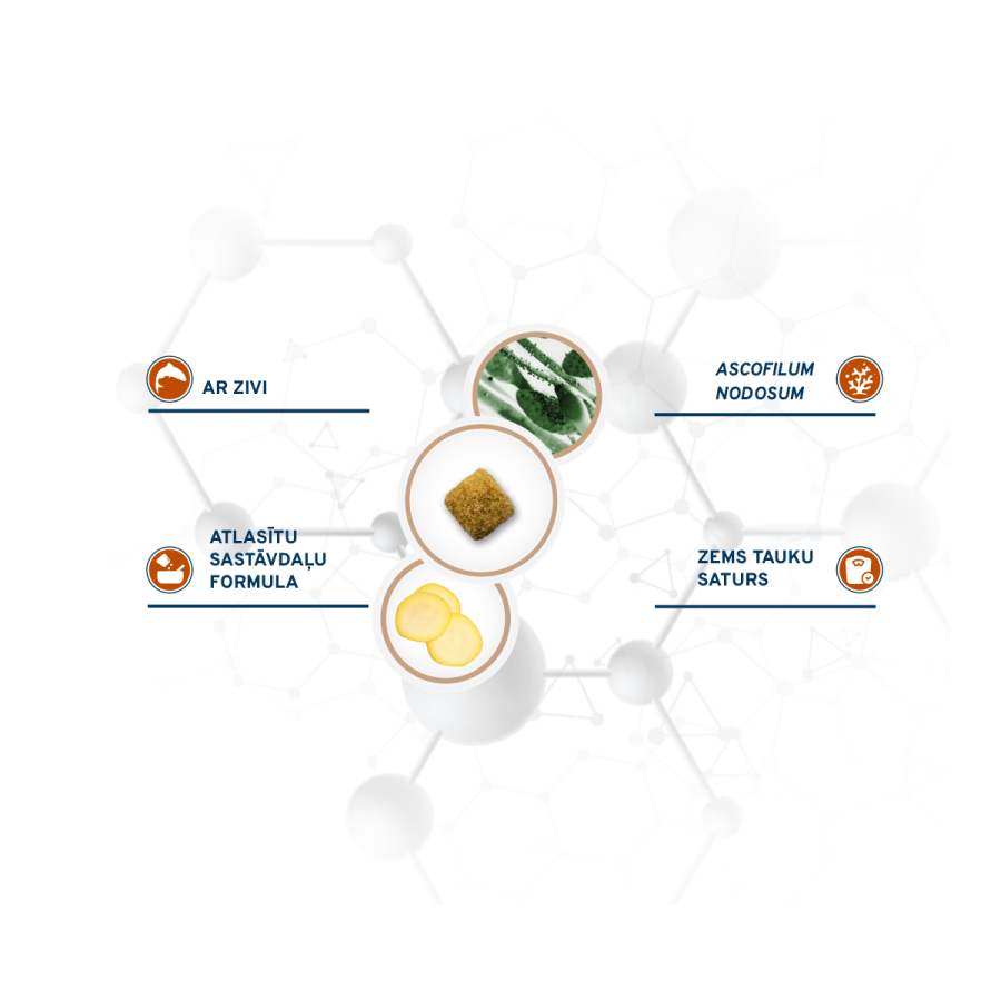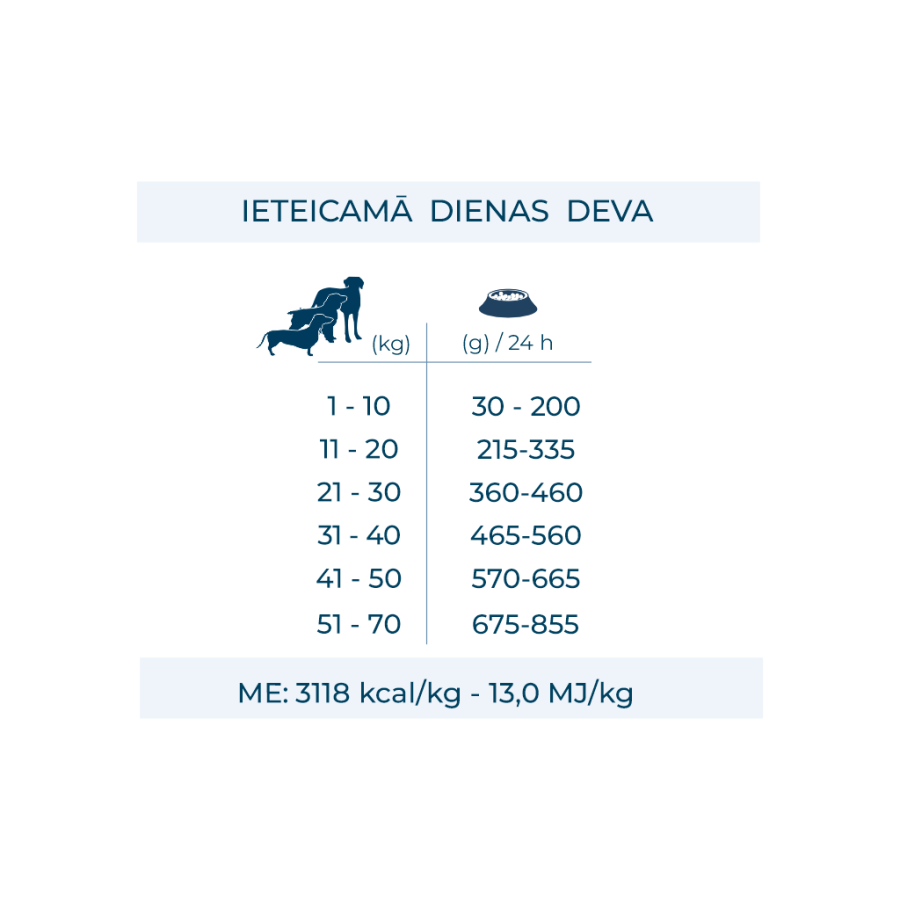 Metabolizējamā enerģija: 3118 kcal/kg - 13,0 MJ/kg.