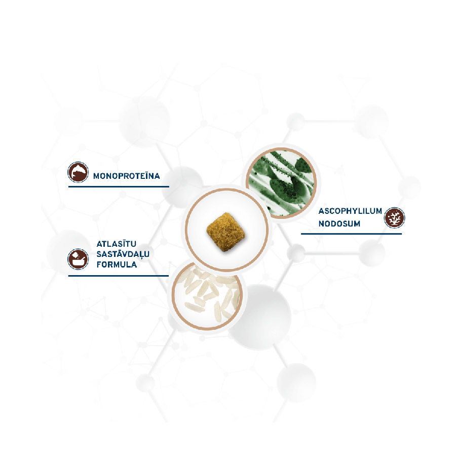 Monoproteīna barība: Sastāvā tikai viens alternatīvs dzīvnieku proteīna avots: zivju proteīns ar augstu bioloģisko vērtību un biopieejamību.