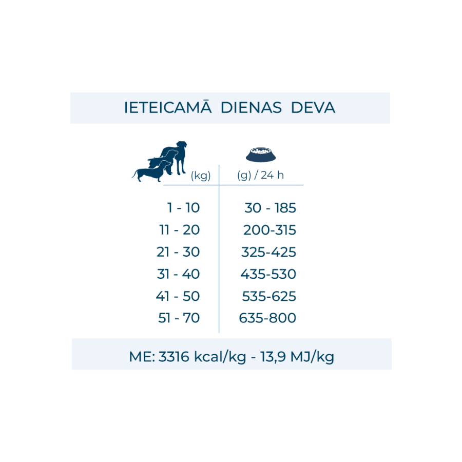 Metabolizējamā enerģija: 3316 kcal/kg – 13,9 MJ/kg.
