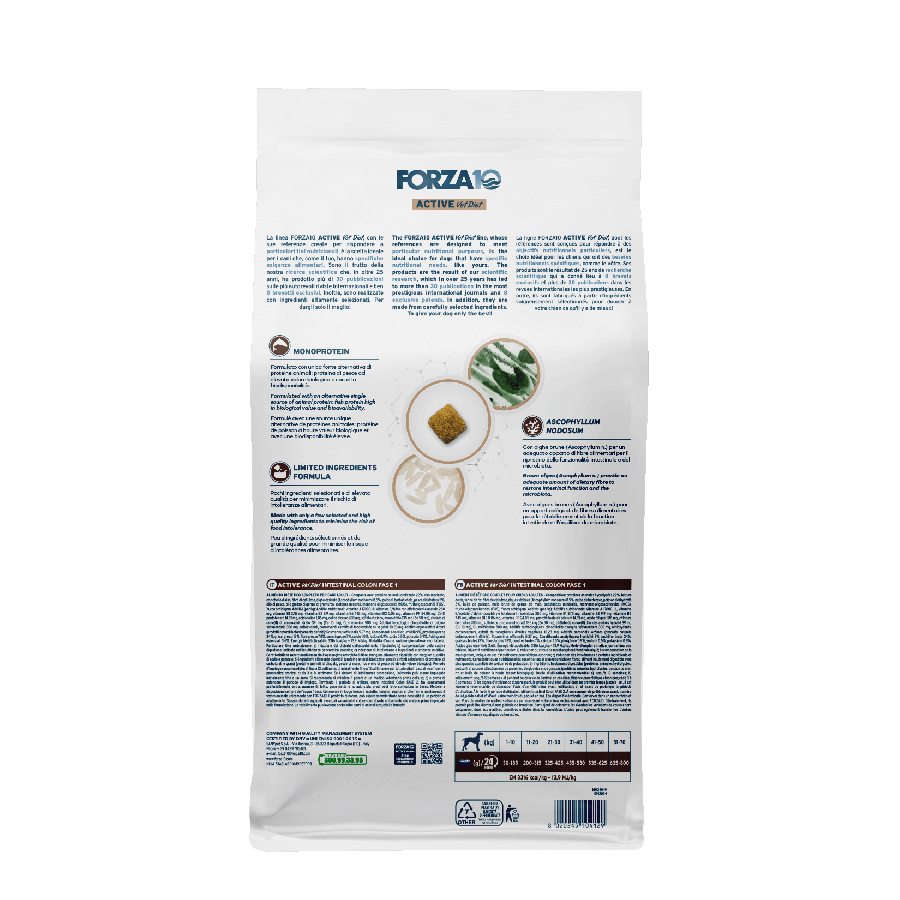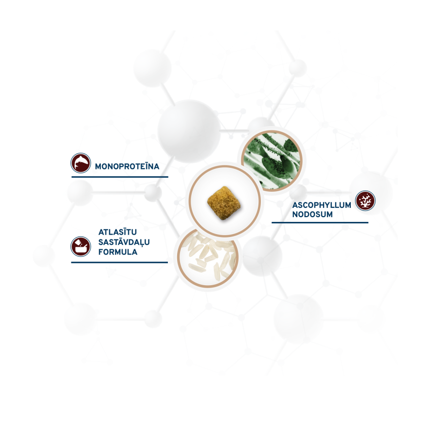 Sastāvs: dzīvnieku proteīnu hidrolizāts 22%, slīpēti rīsi, rīsu atsijas, celulozes šķiedras, žāvētas aļģes (Ascophyllum nodosum) 8,5%, biešu mīkstums, dehidratizētas zivis 5%, zivju eļļa, kukurūzas dīgļu jēleļļa, minerālvielas, mannānoligosaharīdi (MOS), fruktooligosaharīdi (FOS), Yucca schidigera.