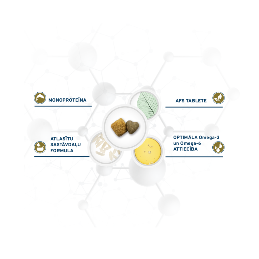 Sastāvā tikai viens alternatīvs dzīvnieku proteīna avots: zivju proteīns ar augstu bioloģisko vērtību un biopieejamību. Formula ar nelielu sastāvdaļu skaitu Izgatavots tikai no dažām atlasītām un augstas kvalitātes sastāvdaļām, lai samazinātu barības nepanesības risku. AFS tablete Botāniski aktīvās sastāvdaļas ir iestrādātas sirds formas tabletēs, lai saglabātu termojūtīgo vielu efektivitāti: