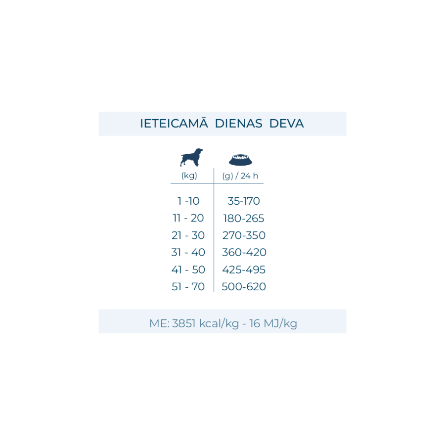 Metabolizējamā enerģija: 3851 kcal/kg - 16 MJ/kg.
