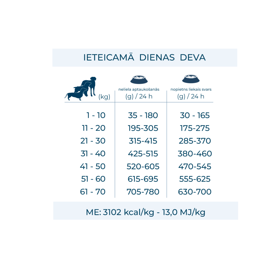 Metabolizējamā enerģija: 3102 kcal/kg – 1,.0 MJ/kg.
