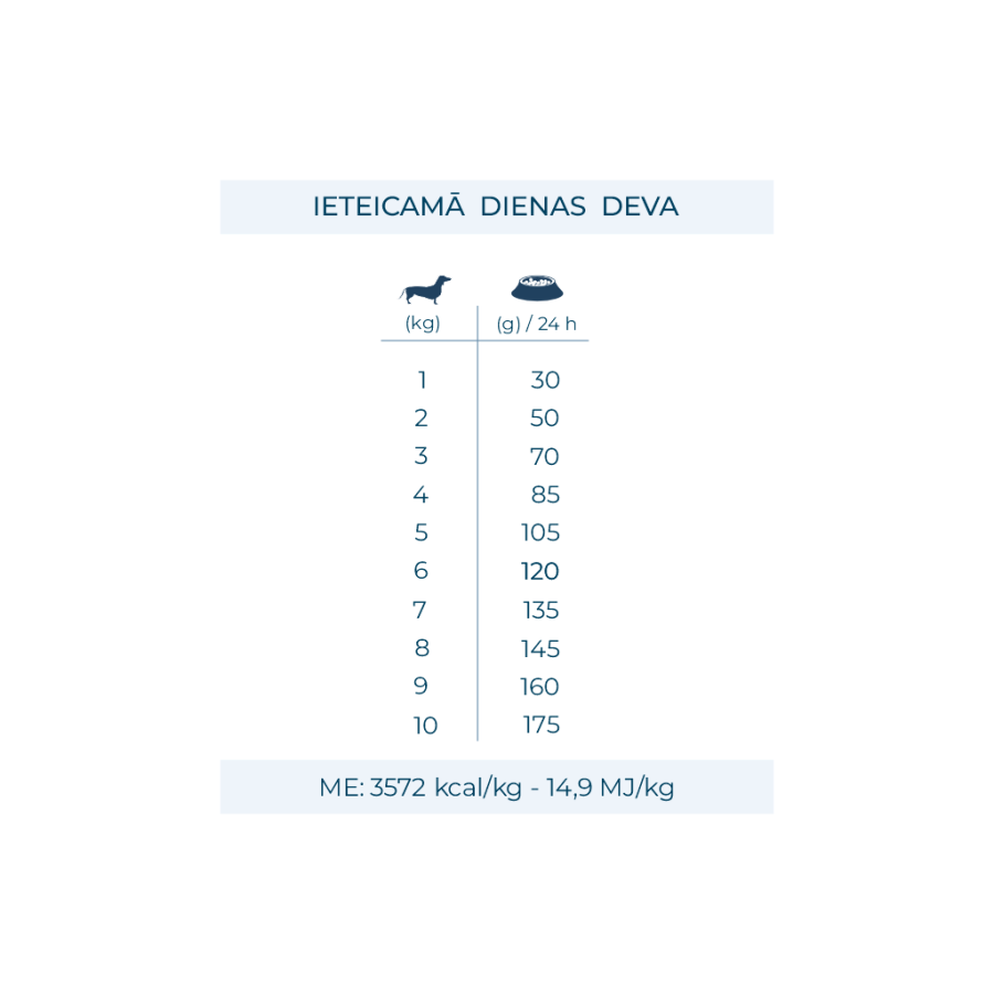 Metabolizējamā enerģija: 3572 kcal/kg – 14,9 MJ/kg.